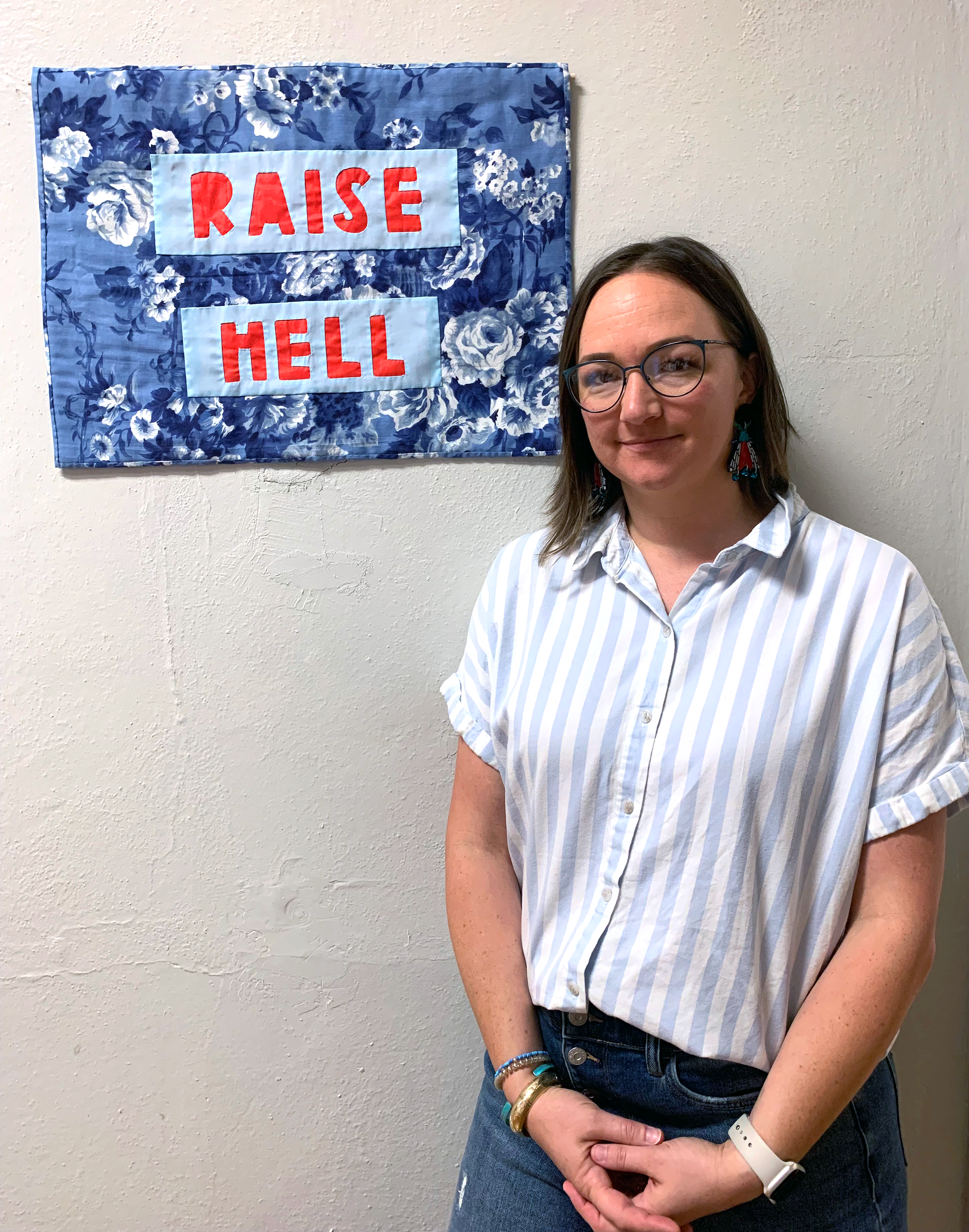 Emily is a fiber and collage artist located in Thomasville, GA. Having graduated with degrees in Economics and Math, her path to becoming an artist was obvious. Actually, having two creative parents that encouraged her to be creative from early childhood gave her a sense of self and confidence that had her turning back to art regularly to feel grounded and present. After a brief career in banking and then becoming a mother, in 2014 Emily opened a sewing and art studio for children to give them the opportunity to learn skills and gain the confidence that she found in making as a child. For seven years she learned as much as she taught and, after selling her business in 2021, Emily took the plunge and is now a full time artist. She is inspired by street art, architecture, feminism, antiques, and double entendre to create art that primarily explores the idea of identity and belonging.
